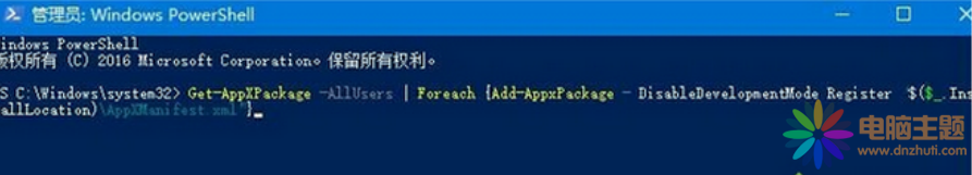 3、最后在框中,直接輸入:Get-AppXPackage -AllUsers | Foreach {Add-AppxPackage - DisableDevelopmentMode Register “$($_.InstallLocation)\AppXManifest.xml”} 按下回車鍵,并等待系統(tǒng)自動(dòng)修復(fù),完成后重啟計(jì)算機(jī)就行了。