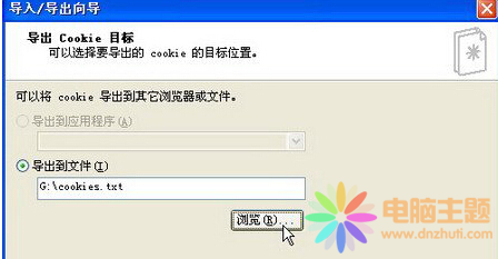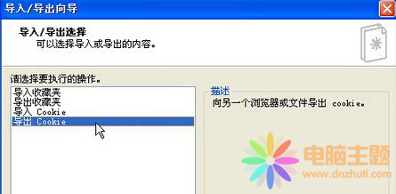 1.首先,咱們需要打開winXP電腦中用戶經(jīng)常使用的,保存過cookies信息的瀏覽器的窗口,在該瀏覽器窗口中,咱們打開“導(dǎo)入/導(dǎo)出向?qū)?rdquo;并單擊“下一步”按鈕,在打開的“導(dǎo)入/導(dǎo)出選擇”向?qū)ы撝羞x中“導(dǎo)出Cookie”選項(xiàng),并單擊“下一步”按鈕。